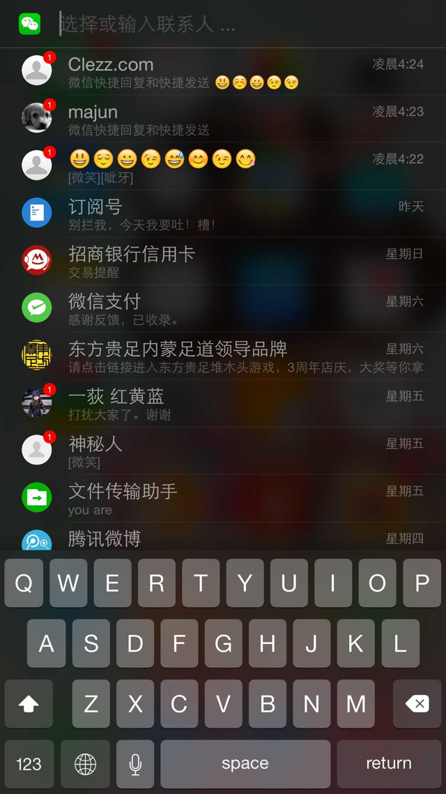 官方给出的功能介绍:1.任何地方快捷回复。2.任何地方快捷发送。3.显示最近会话联系人。4.显示最新会话记录。5.显示联系人头像。6.显示未读消息数。7.支持搜索或输入联系人。8.支持发送图片。