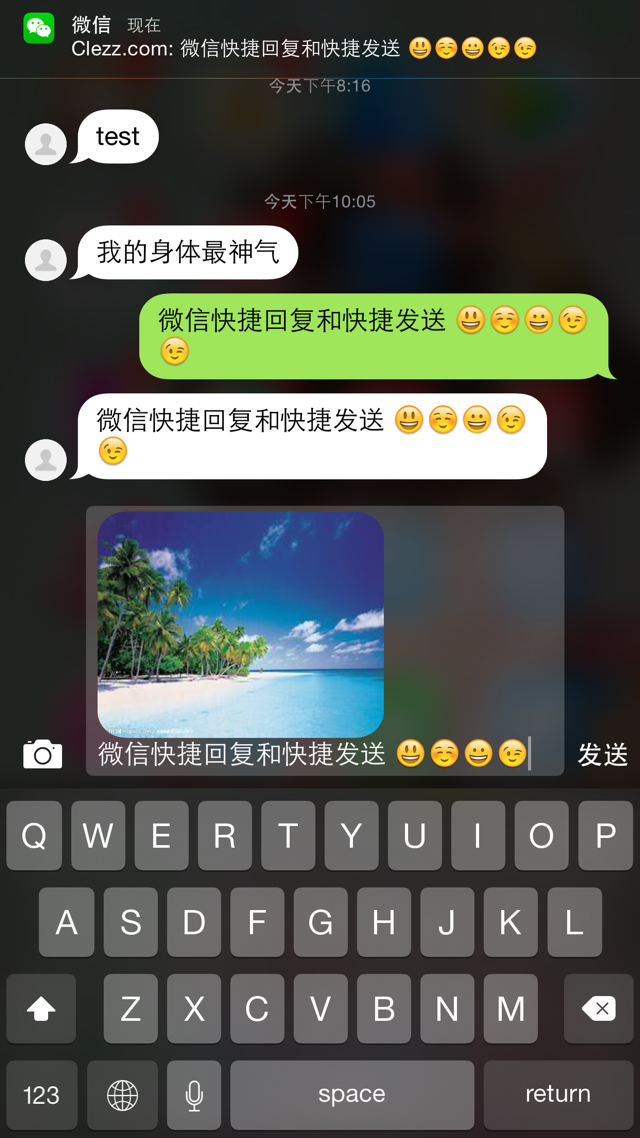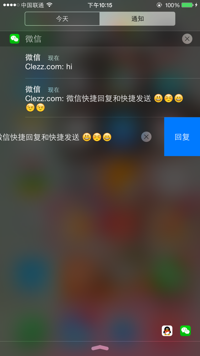 2、快捷发送: – 点通知中心快捷回复图标激活快捷发送。 – 使用QuickDo或Actiator设置手势激活快捷发送。