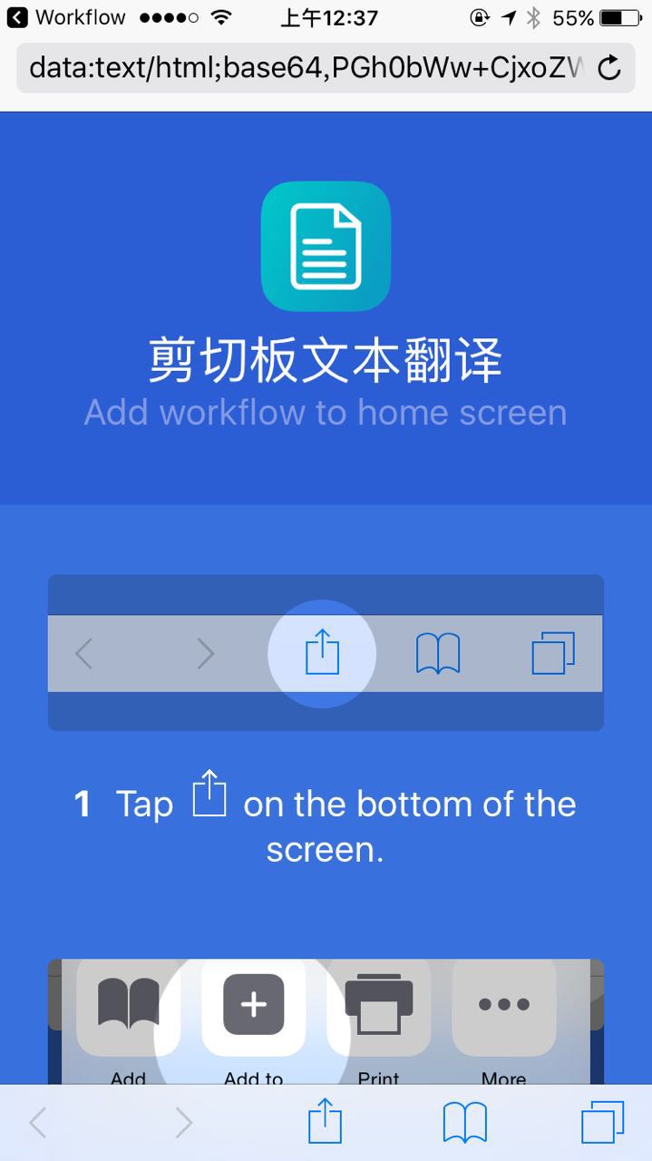 10.最后我们来制作一个快捷运行翻译功能的图标就可以了,我们点击“Add to Home Screen”然后会自动跳转到Safari浏览器,页面钟会显示添加图标到桌面的方法,我们点击下方的扩展功能添加到主屏幕即可,这时我们桌面上就有了一个点击即可运行翻译剪切板的图标了。