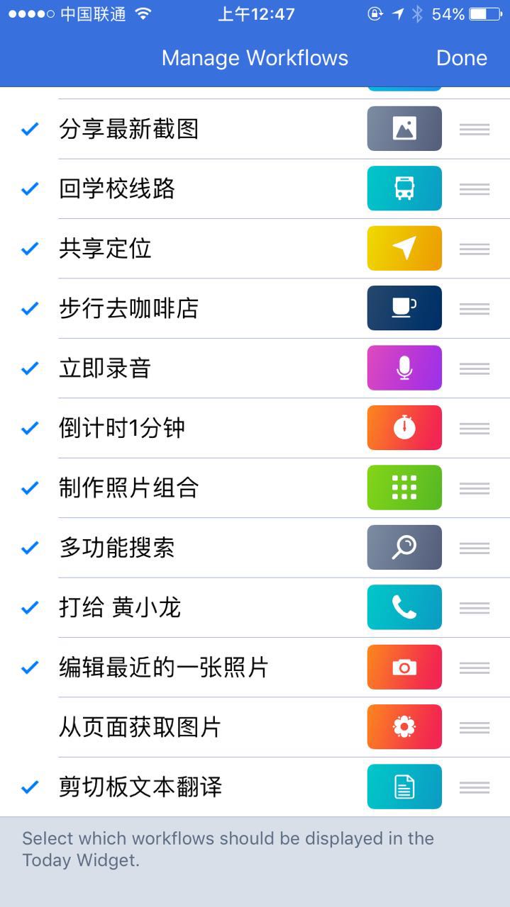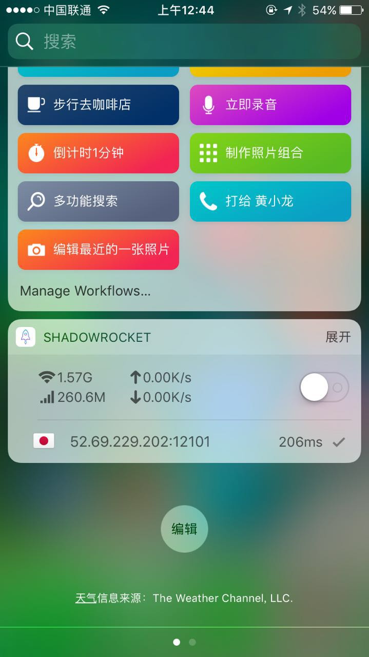 11.除了添加到桌面图标之外,还可以添加到下拉菜单的小部件中,运行相对比桌面图标更快捷一些,因为桌面图标是点击后先打开Safari然后打开Workflow再运行工作流,小部件中就是直接运行Workflow进行工作流,所以相比图标是要快一点。我们在下拉菜单中点编辑,然后将Workflow添加到Widget小部件中。