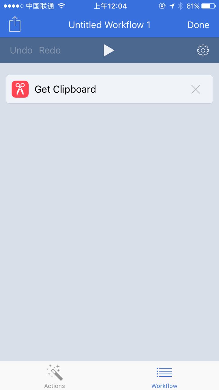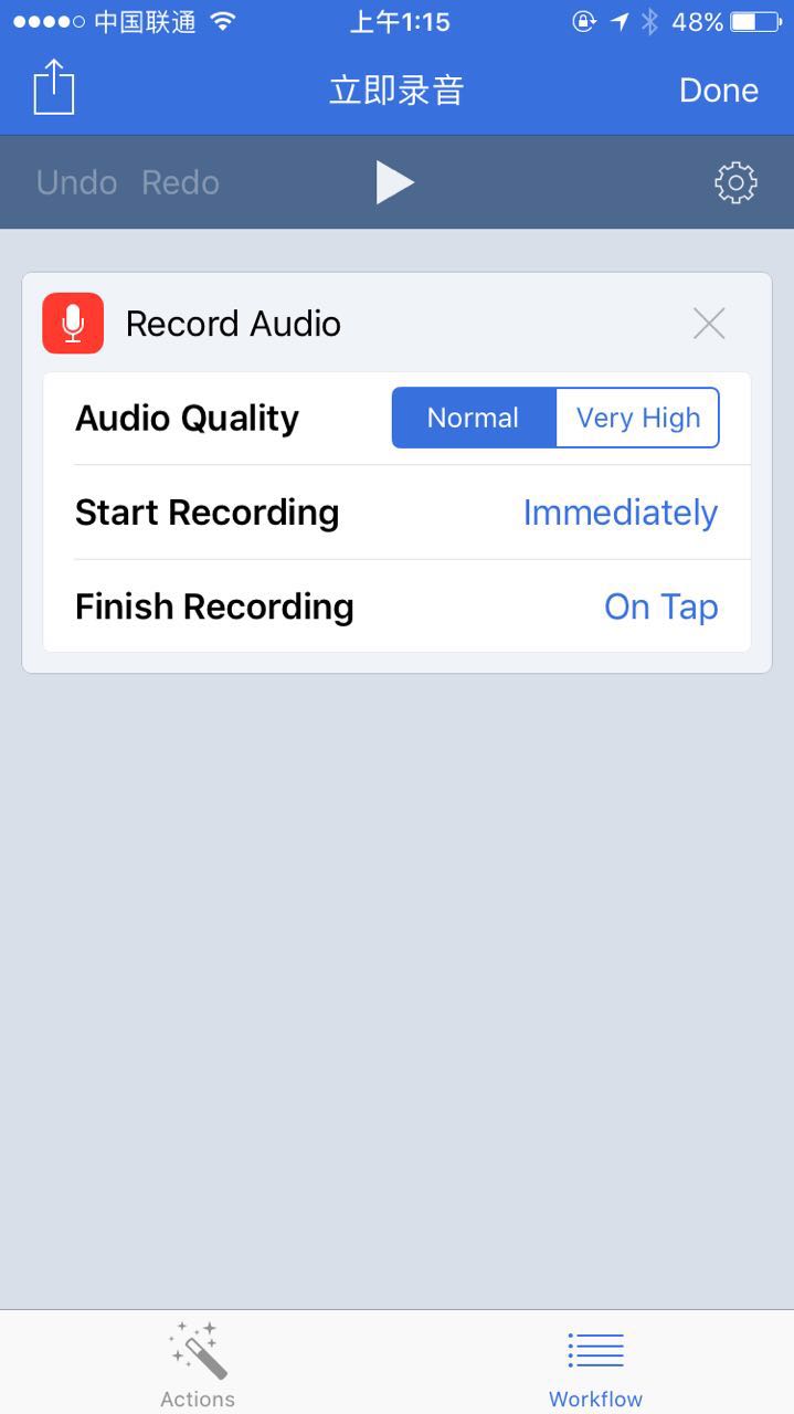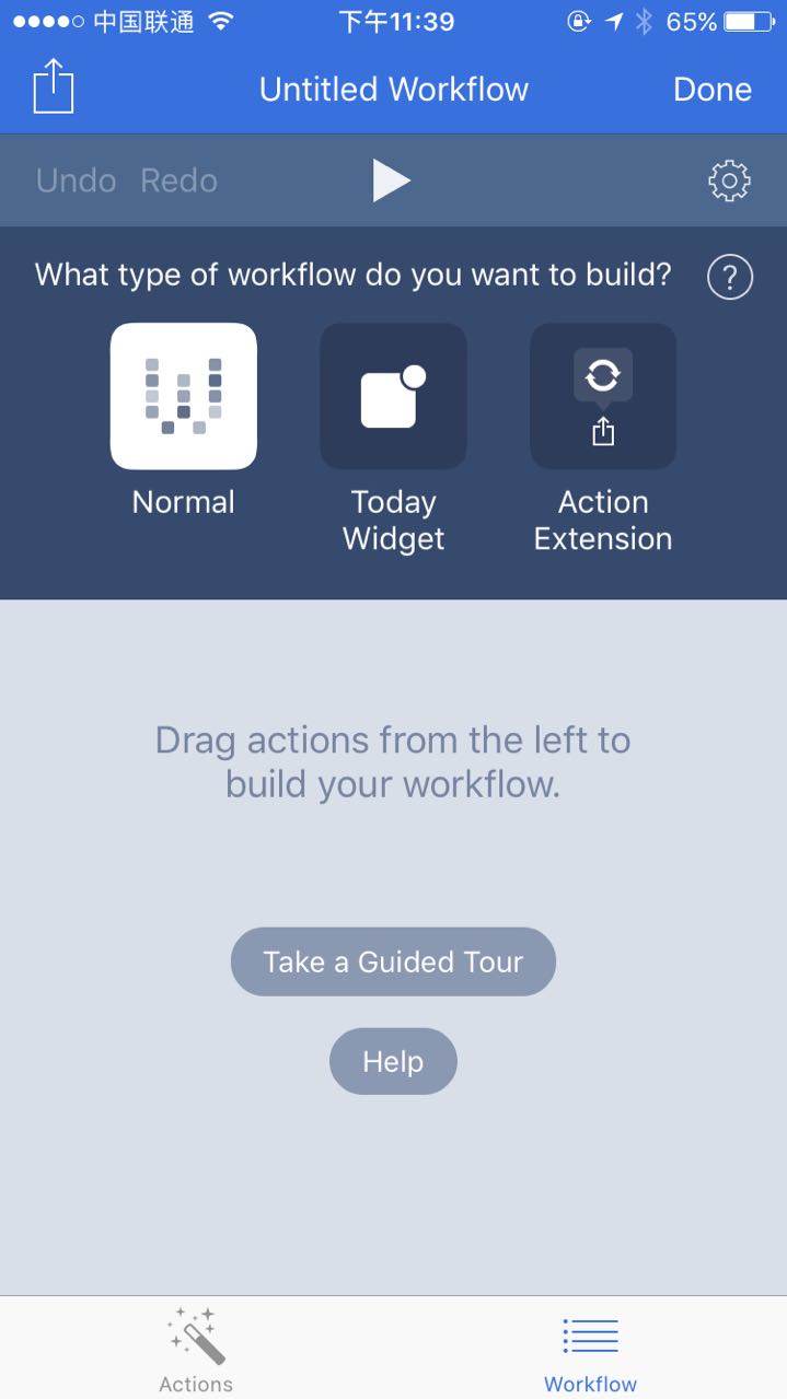 2.然后就看到制作工作流的界面了,顶部的Untitled Workflow 1这是这个工作流的名称,下一行分别是 undo撤销,redo重做,三角形式运行按钮,最右是设置按钮,再下一行是选择需要建立什么类型的工作流,分别是正常的,今日小部件里面,功能扩展里面。我们先就按照默认的Normal,然后点击左下方的Actions。