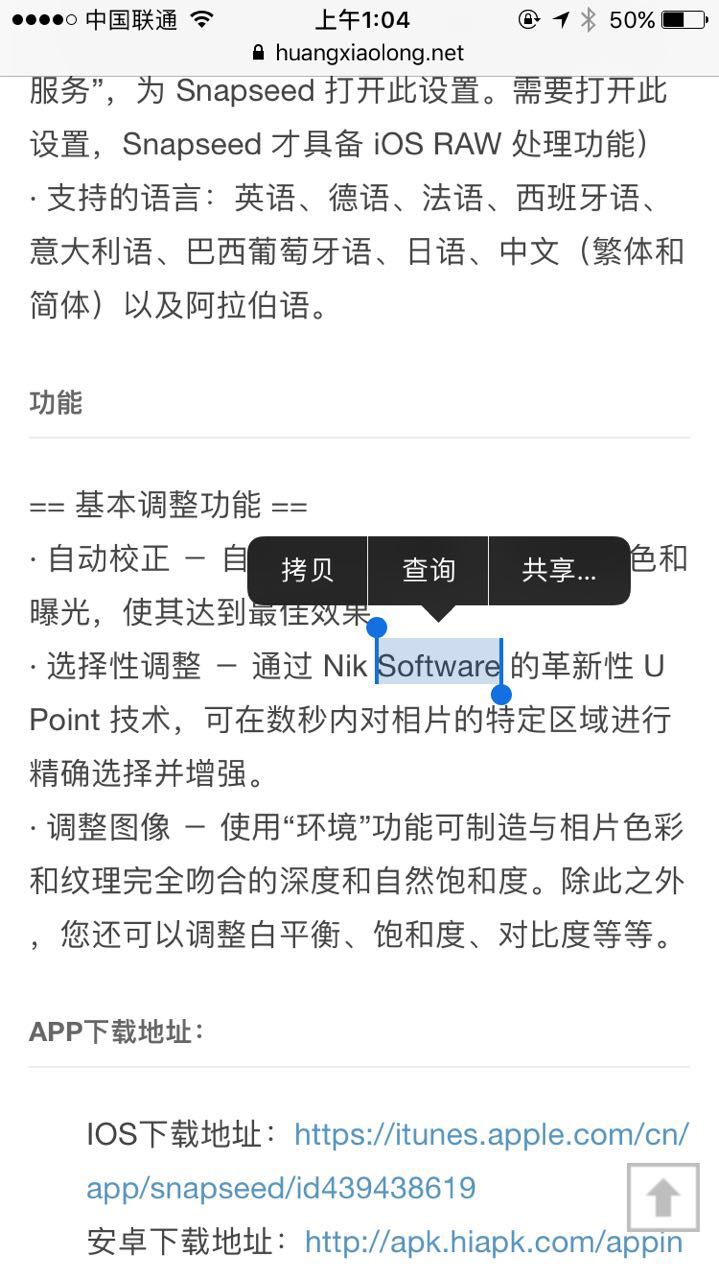 2.在浏览器中翻译选中的文本,平常在浏览网页中遇到陌生单词我们都可能会复制到百度或者翻译APP中查询,但是现在我们只用选中不认识的词句,然后通过“共享”按钮,打开扩展功能来运行workflow翻译,如下图。