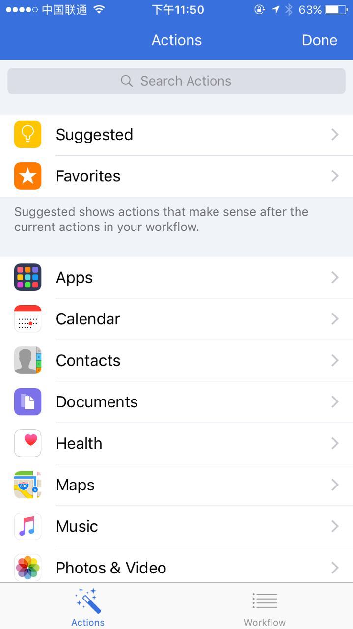 3.点击Actions功能之后,会进入Suggested建议界面,这里会显示建议的一些流程功能选项,我们也可以点击左上角的Actions进入功能分类的主页,然后可以根据你需要制作的工作流选择对应的分类进入再选择具体的流程功能,如果英语不好的话,可以去翻译一下。