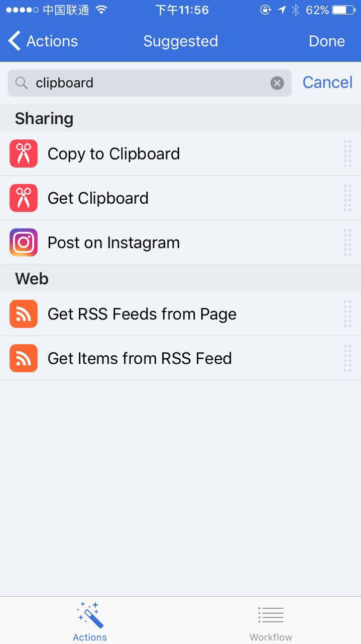 4.我以“一键翻译剪切板文字”这个工作流的制作方法为例,来简单说明一下工作流的制作方法。我们先在搜索框中输入“Clipboard”来搜索剪切板的功能,然后选择“Get Clipboard”这个选项并长按住,然后稍微移动一下,这个功能就会自动来到我们的工作流制作页面,然后就可以松手了,相当于工作流的第一步已经做好了,就是获取剪切板的内容。