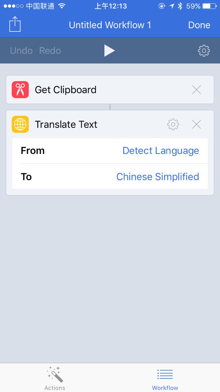 5.和前面一样,继续点击Actions来选择下一步的功能,因为剪切板的内容已经可以获取了,下一步直接翻译即可,所以我们搜索“translate text”,然后长按并移动结果中的“Translate Text”选项到工作流中,因为是第二步,所以要移动到“Get Clipboard”的下面。