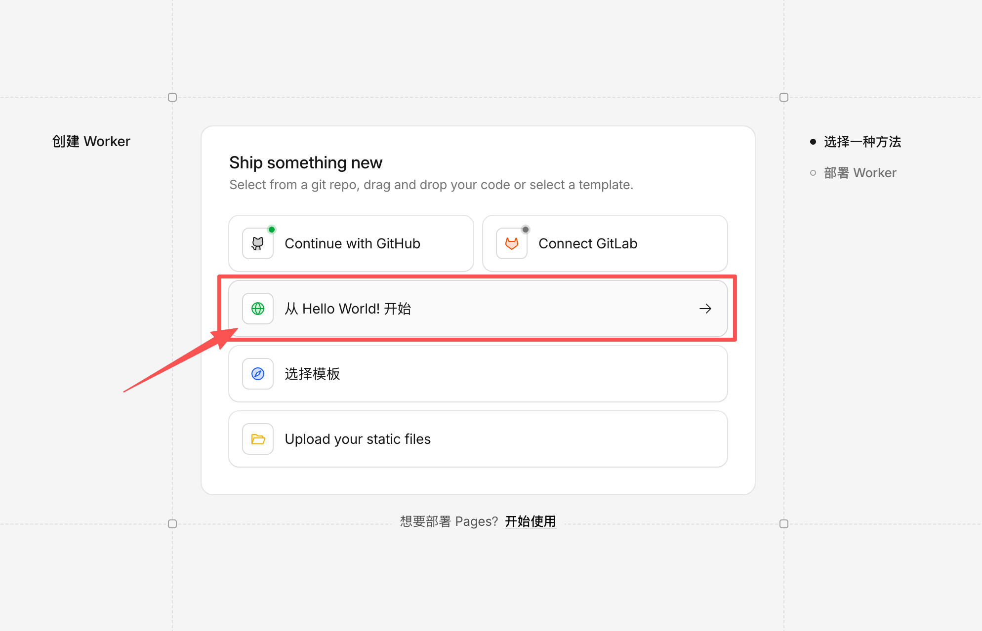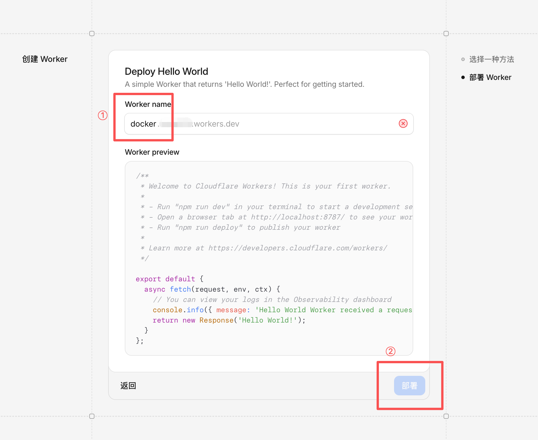 - 点击 从 Hello World! ,输入 Worker name(自定义子域名),点击 部署。