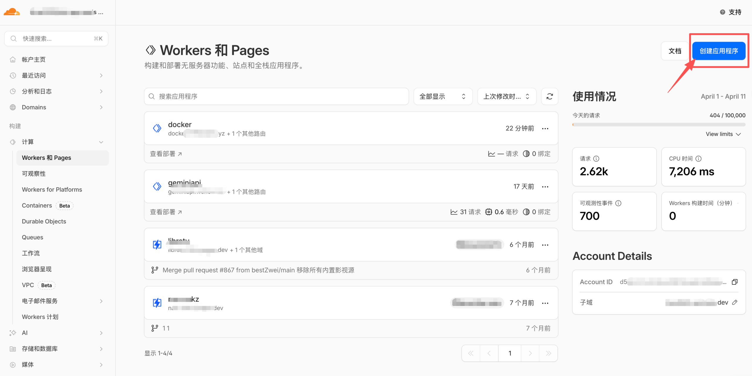 - 进入 Workers 和 Pages -> 创建应用程序,